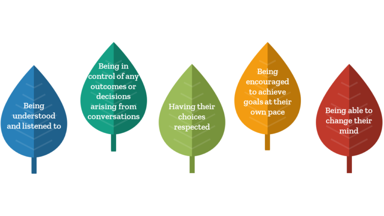 • Acknowledge and respect those times when clients do not wish to engage, or only talk about what’s acceptable to them. Reluctance to discuss certain things may be a coping strategy or defence mechanism to manage their fears or concerns. Our role is to help clients to explore how their quality of life can be improved, while at the same time accepting the limitations of what we’re able to achieve.
