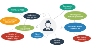 Some of what you wish to discuss with clients is likely to feel very new, and outside the comfort zone of what you know and generally talk to clients about (i.e. recovery, and moving toward independent living). It may be helpful therefore to consider at some point what, (if any) difficulties arise for you when thinking about a client’s palliative and end of life care, and how these difficulties may impact on your interactions with them.