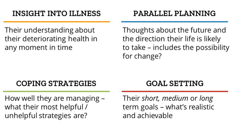 There are many things we may wish to explore with clients at different times and stages of their illness. Some are outlined below, but there might be other things that resonate with you or your client that you wish to raise.